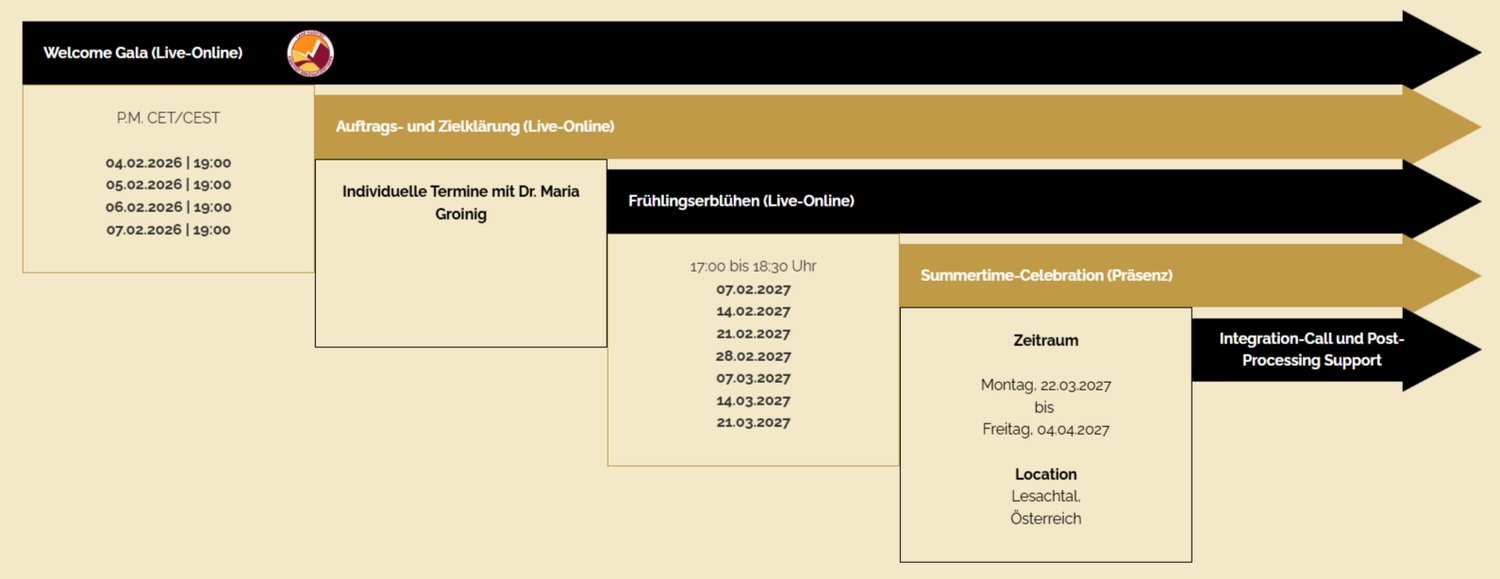 Das Check-in startet mit der kostenfreien Welcome Gala und/oder dem Gespräch zur Auftrags- und Zielklärung, an dem du bereits teilnehmen und profitieren kannst. Nutze den Tag und deine Chancen!
